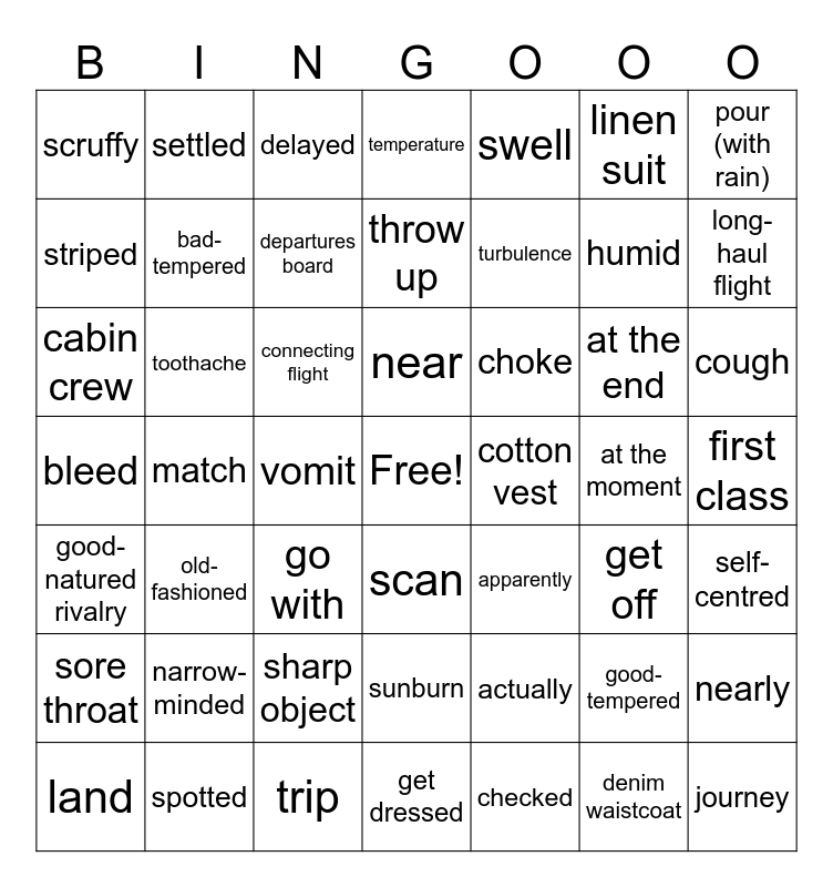 This bingo card has a free space and 198 words: foolproof, geek, good-natured rivalry, gut feeling, job-seeker, light-hearted response, the point of, work–life balance, absent-minded, bad-tempered, big-headed, easy-going, good-tempered, laid-back, narrow-minded, open-minded, self-centred, strong-willed, tight-fisted, two-faced, well-balanced, well-behaved, allergic reaction, be sick, bleed, blister, (high / low) blood pressure, burn, choke, cold, come round, cough, cut, diarrhoea, dizzy, earache, faint, feel sick, flu, food poisoning, get over, headache, hurt, lie down, pass out, rash, sore throat, sprain, stomach ache, sunburn, swell, temperature, throw up, toothache, unconscious, vomit, casual, checked, classic, cotton vest, denim waistcoat, dress up, fit, fur collar, get changed, get dressed, get undressed, go with, hang up, hooded, lace top, leather sandals, linen suit, long-sleeved, loose, lycra swimsuit, match, old-fashioned, patterned, plain, scruffy, silk scarf, sleeveless, smart, spotted, striped, suede boots, suit, tight, velvet bow tie, V-neck, wool(len) cardigan, airport terminal, aisle, bag(gage) drop, baggage reclaim, board, boarding pass, business, cabin crew, check, check in, check-in desk, closed, collect, connecting flight, customs, delayed, departures board, direct flight, drop off, first class, flight time, fill in, gate, get off, get on, hand luggage, illegal goods, jet lag, journey, land, liquid, long-haul flight, (airline) lounge, luggage, on time, pick up, pick up, row, runway, scan, seat belt, security, sharp object, take off, travel, trip, trolley, turbulence, actually, apparently, at the end, at the moment, basically, certainly, especially, even, eventually, ever, gradually, hard, hardly, ideally, in fact, in the end, late, lately, near, nearly, obviously, specially, still, yet, below zero, blizzard, boiling, breeze, bright, changeable, chilly, clear, cool, damp, drizzle, drought, flood, fog, freezing, hail, heatwave, heavy, humid, hurricane, icy, lightning, mild, mist, monsoon, pour (with rain), settled, shower, smog, strong, sunny, thick, thunder and warm.