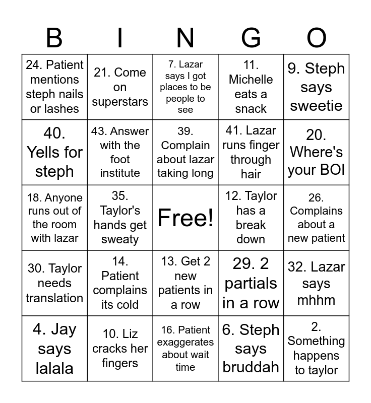 This bingo card has a free space and 44 words: 1. Liz says my back hurts, 2. Something happens to taylor, 3. Jay pretends to shank you, 4. Jay says lalala, 5. Michelle says her legs hurt, 6. Steph says bruddah, 7. Lazar says I got places to be people to see, 8. Lazar mentions his hemorrhoids, 9. Steph says sweetie, 10. Liz cracks her fingers, 11. Michelle eats a snack, 12. Taylor has a break down, 13. Get 2 new patients in a row, 14. Patient complains its cold, 15. Patient makes lazar turn red, 16. Patient exaggerates about wait time, 17. Someone asks for a new tip, 18. Anyone runs out of the room with lazar, 19. "Interestingggggg", 20. Where's your BOI, 21. Come on superstars, 22. Idk I just work here, 23. Patients argue with steph, 24. Patient mentions steph nails or lashes, 25. Taylor has a hot flash, 26. Complains about a new patient, 27. Patient says we're busy, 28. Lazar says where am I at, 29. 2 partials in a row, 30. Taylor needs translation, 31. Jay gets zoomies, 32. Lazar says mhhm, 33. Michelle and steph argue, 34. Lazar ignores you, 35. Taylor's hands get sweaty, 36. Steph says ok and how can I help you, 37. Guilty/what are you up to, 38. Come on slackers, 39. Complain about lazar taking long, 40. Yells for steph, 41. Lazar runs finger through hair, 42. Patients yell from injection, 43. Answer with the foot institute and 44. Talk to me goose.