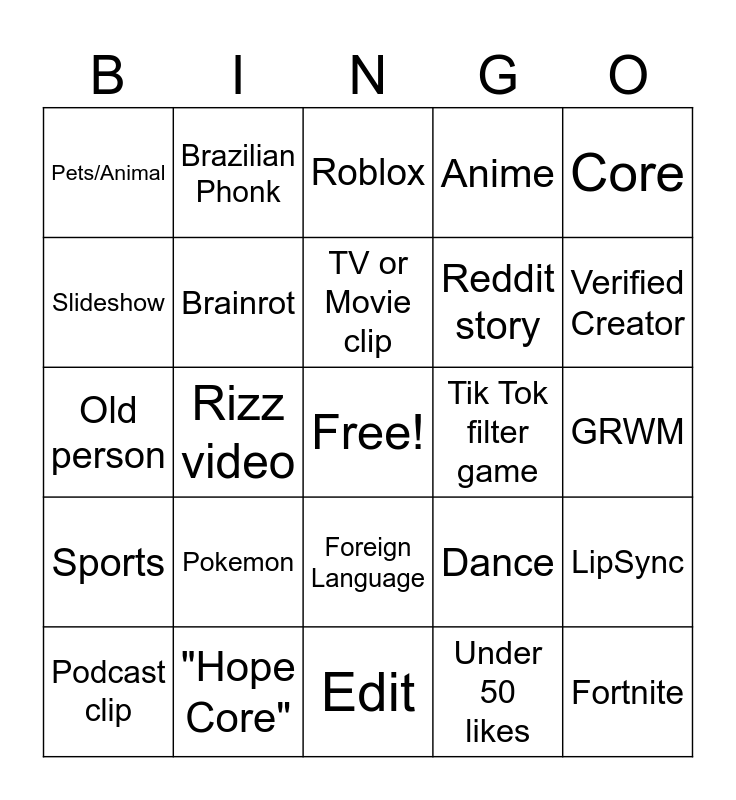 This bingo card has a free space and 24 words: Pokemon, "Hope Core", TV or Movie clip, Podcast clip, Core, Pets/Animal, Slideshow, Brazilian Phonk, Tik Tok filter game, Foreign Language, Reddit story, Old person, Dance, LipSync, Brainrot, Under 50 likes, GRWM, Roblox, Verified Creator, Rizz video, Fortnite, Sports, Anime and Edit.