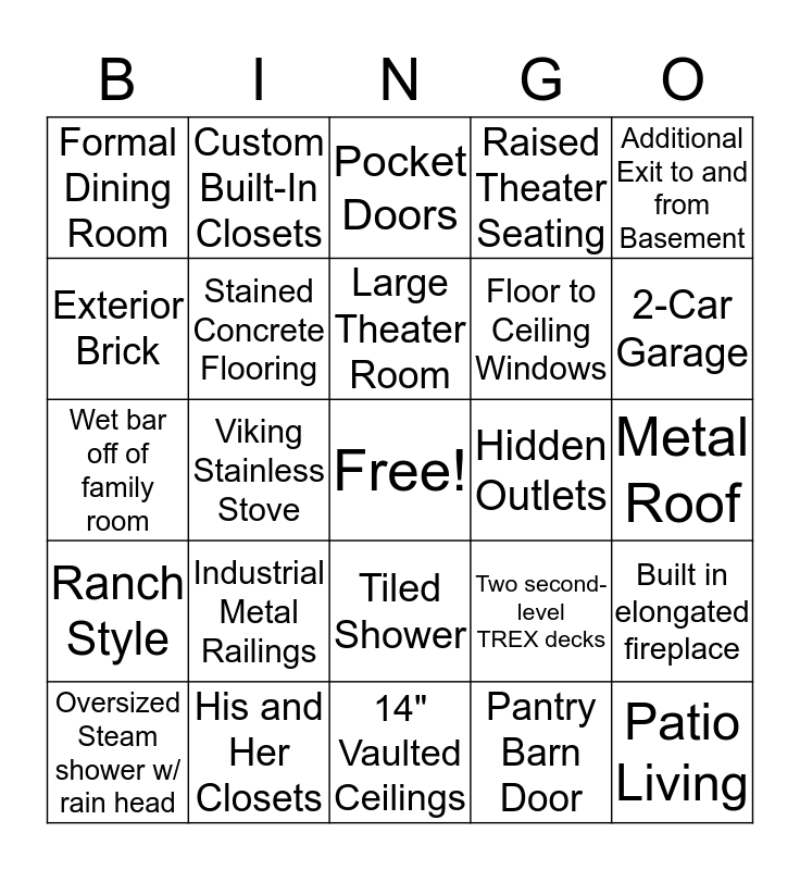 This bingo card has a free space and 24 words: Industrial Metal Railings, His and Her Closets, Large Theater Room, Oversized Steam shower w/ rain head, Additional Exit to and from Basement, Formal Dining Room, Exterior Brick, Custom Built-In Closets, Hidden Outlets, Tiled Shower, Floor to Ceiling Windows, Wet bar off of family room, Two second-level TREX decks, Built in elongated fireplace, Stained Concrete Flooring, Pantry Barn Door, Metal Roof, Pocket Doors, 2-Car Garage, Viking Stainless Stove, Patio Living, Ranch Style, Raised Theater Seating and 14" Vaulted Ceilings.