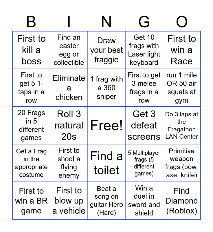 This bingo card has a free space and 24 words: First to shoot a flying enemy, First to blow up a vehicle, 1 frag with a 360 sniper, First to win a BR game, First to win a Race, First to kill a boss, First to get 5 1-taps in a row, Find an easter egg or collectible, Get 3 defeat screens, Find a toilet, First to get 3 melee frags in a row, 20 Frags in 5 different games, 5 Multiplayer frags (5 different games), Primitive weapon frags (bow, axe, knife), Eliminate a chicken, Win a duel in sword and shield, Do 3 laps at the Fragathon LAN Center, Draw your best fraggie, run 1 mile OR 50 air squats at gym, Roll 3 natural 20s, Find Diamond (Roblox), Get a Frag in the appropriate costume, Get 10 frags with Laser light keyboard and Beat a song on guitar Hero (Hard).