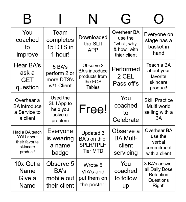 This bingo card has a free space and 24 words: Everyone is wearing a name badge, Observe 5 BA's mobile out their client, Observe 2 BA's introduce products from the FOS Tables, 10x Get a Name Give a Name, Everyone on stage has a basket in hand, You coached to improve, Hear BA's ask a GET question, Team completes 15 DTS in 1 hour!, You coached to Celebrate, Updated 3 BA's on thier SPLH/TPLH Tier MTD, Performed 2 CEL Pass off's, Overhear a BA introduce a Service to a client, Observe a BA Mult-client servicing, Overhear BA use the verbal commitment with a client, 5 BA's perform 2 or more DTS's w/1 Client, You coached to follow up, Skill Practice Multi world selling with a BA, Downloaded the SLII APP, Teach a BA about your favorite skincare product!, Used the SLII App to help you solve a problem, 3 BA's answer all Daily Dose Retention Questions Right!, Had a BA teach YOU about their favorite skincare product!, Overhear BA use the "what, why, & how" with thier client and Wrote 5 VIA's and put them on the poster!.