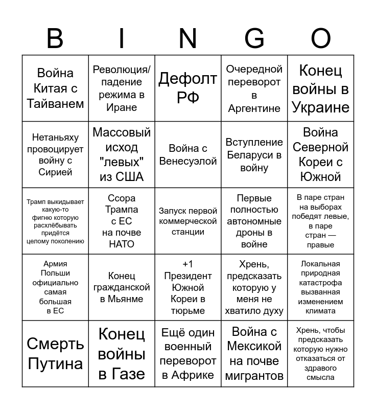 This bingo card has 25 words: Конец гражданской в Мьянме, Ещё один военный переворот в Африке, Война с Венесуэлой, Смерть Путина, Конец войны в Украине, Война Китая с Тайванем, Нетаньяху провоцирует войну с Сирией, Революция/падение режима в Иране, Первые полностью автономные дроны в войне, +1 Президент Южной Кореи в тюрьме, Вступление Беларуси в войну, Трамп выкидывает какую-то фигню которую расхлёбывать придётся целому поколению, Хрень, предсказать которую у меня не хватило духу, Локальная природная катастрофа вызванная изменением климата, Массовый исход "левых" из США, Хрень, чтобы предсказать которую нужно отказаться от здравого смысла, В паре стран на выборах победят левые, в паре стран — правые, Дефолт РФ, Война Северной Кореи с Южной, Ссора Трампа с ЕС на почве НАТО, Запуск первой коммерческой станции, Конец войны в Газе, Армия Польши официально самая большая в ЕС, Очередной переворот в Аргентине and Война с Мексикой на почве мигрантов.