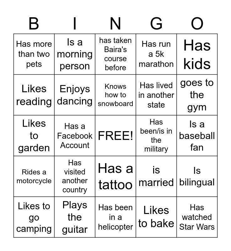 This bingo card has a free space and 24 words: Has visited another country, Plays the guitar, Knows how to snowboard, Likes to go camping, Has kids, Has more than two pets, Likes reading, Is a morning person, Has been/is in the military, Has a tattoo, Has lived in another state, Likes to garden, is married, Is bilingual, Enjoys dancing, Likes to bake, Is a baseball fan, has taken Baira's course before, goes to the gym, Has a Facebook Account, Has watched Star Wars, Rides a motorcycle, Has run a 5k marathon and Has been in a helicopter.