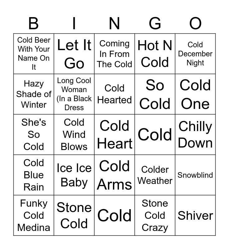This bingo card has 50 words: Cold As Ice, Cold Heart, Freeze-Frame, Cold, Ice Ice Baby, Frozen, Let It Go, Sweater Weather, Hazy Shade of Winter, Tenth Avenue Freeze-Out, Long Cool Woman (In a Black Dress, Hot N Cold, Snowblind, Colder Weather, A Long December, Let It Snow! Let It Snow! Let It Snow!, Cold Hearted, Cold, Cold Cold Cold, Cold December Night, Cold Wind Blows, Stone Cold Crazy, Cold Beer With Your Name On It, So Cold, Shivers, Shiver, Cold One, Cold One Comin' On, Coming In From The Cold, Cold Arms, Cold Coffee, Cold As You, Cold Desert, Cold. Cold Heart, Stone Cold, Stone Cold Crazy, The Cold Wind, Cold Shoulder, It's a Cold One out Tonight, Chilly Down, St. Patrick's Day, When the Cold Comes, Chill In The Air, In The Air Tonight, Funky Cold Medina, She's So Cold, Cold Blooded, Cold Day In The Sun, Cold Blue Rain and Cold Water.