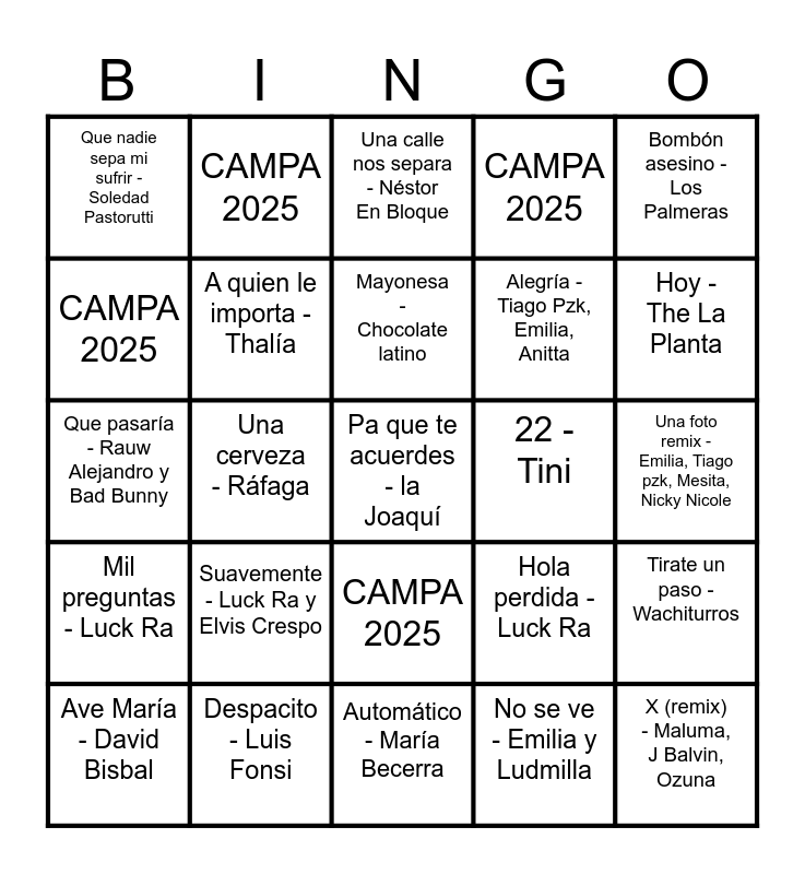 This bingo card has a free space and 29 words: Despecha - La Rosalía, Despacito - Luis Fonsi, Una calle nos separa - Néstor En Bloque, Amor Salvaje - Chaqueño Palavecino, Bombón asesino - Los Palmeras, Que nadie sepa mi sufrir - Soledad Pastorutti, A quien le importa - Thalía, Mayonesa - Chocolate latino, 22 - Tini, Tirate un paso - Wachiturros, Ave María - David Bisbal, Una cerveza - Ráfaga, No se ve - Emilia y Ludmilla, X (remix) - Maluma, J Balvin, Ozuna, Que pasaría - Rauw Alejandro y Bad Bunny, Playlist - Emilia, Automático - María Becerra, Hola perdida - Luck Ra, Hoy - The La Planta, Mil preguntas - Luck Ra, Suavemente - Luck Ra y Elvis Crespo, Un siglo sin Ti - luck Ra y chayanne, Alegría - Tiago Pzk, Emilia, Anitta, Una foto remix - Emilia, Tiago pzk, Mesita, Nicky Nicole, CAMPA 2025, CAMPA 2025, CAMPA 2025, CAMPA 2025 and CAMPA 2025.