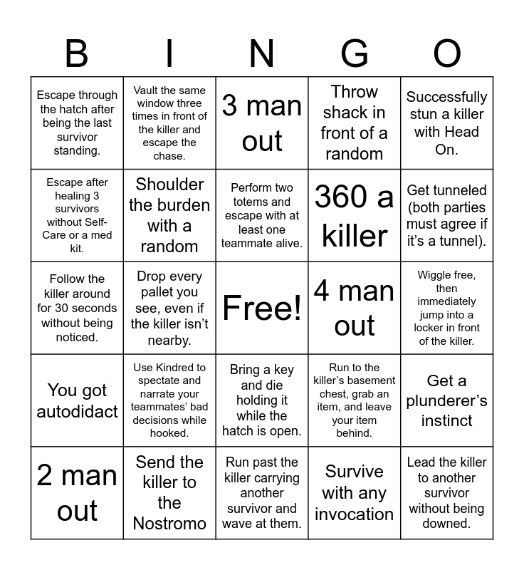 This bingo card has a free space and 59 words: Survive With No Mither, Send the killer to the Nostromo, Get off of the killer while picked up and have Boil Over, You got autodidact, Survive with any invocation, You survived with at least 2 exhaustion perks, Shoulder the burden with a random, Duck under the xenomorph tail shot attack, 360 a killer, Crouch tech a killer, Throw shack in front of a random, Say you know the killer is The Legion and then send the survivors to the Gideon Meat Packing plant, Escape after healing 3 survivors without Self-Care or a med kit., Sabotage 3 hooks in one match without being hooked yourself., Complete a generator within 10 meters of the killer., Escape through the hatch after being the last survivor standing., Lead the killer to another survivor without being downed., Successfully stun a killer with Head On., Use Dead Hard to avoid a killer’s basic attack and then t-bag., Perform two totems and escape with at least one teammate alive., 4 man out, 3 man out, 2 man out, Get a plunderer’s instinct, Bring a flashlight to counter a killer without eyes (e.g., The Hag, The Plague)., Save a teammate from the hook within 3 seconds of the killer leaving., Killer has No Way Out but you still escape., Cleanse the killer’s Hex and get instantly tunneled (both parties must agree if it’s a tunnel)., Get tunneled (both parties must agree if it’s a tunnel)., Dodge a chainsaw attack by hiding behind a tree., Loop the killer around the same object for over 30 seconds., Point at the killer in plain view while standing in front of an unfinished generator., Get balanced landing, Use Deliverance to unhook yourself and immediately get downed again., Vault the same window three times in front of the killer and escape the chase., Sandbag a random teammate into getting hit, then save them later in the game., Let the killer Mori someone else while crouching nearby and teabagging., Drop every pallet you see, even if the killer isn’t nearby., Point at a random teammate to make the killer chase them instead of you., Follow the killer around for 30 seconds without being noticed., Heal a teammate in the killer’s Terror Radius., Use Kindred to spectate and narrate your teammates’ bad decisions while hooked., Wiggle free, then immediately jump into a locker in front of the killer., Fake working on a generator by crouching and standing repeatedly next to it., Try to flashlight save a teammate but miss the timing entirely., Get chased, vault the same pallet three times, and still lose the chase., Use Borrowed Time to take a protection hit, then immediately go down yourself., Spend an entire match crouching everywhere instead of running., Bring a key and die holding it while the hatch is open., Run past the killer carrying another survivor and wave at them., Body-block a teammate trying to enter the exit gate for no reason, 99% a generator and leave it unfinished just to annoy your team., Heal yourself with a med kit while a teammate is bleeding out nearby., Vault a window or drop a pallet in front of a teammate running from the killer., Let a Hex Totem stay up all game because you think it’s Haunted Ground., Run to the killer’s basement chest, grab an item, and leave your item behind., Point at a teammate, teabag, and then run away when the killer arrives., Alex’s Toolbox + Brand new part, use it, and then escape. and Use the skeleton key to open the hatch and escape..