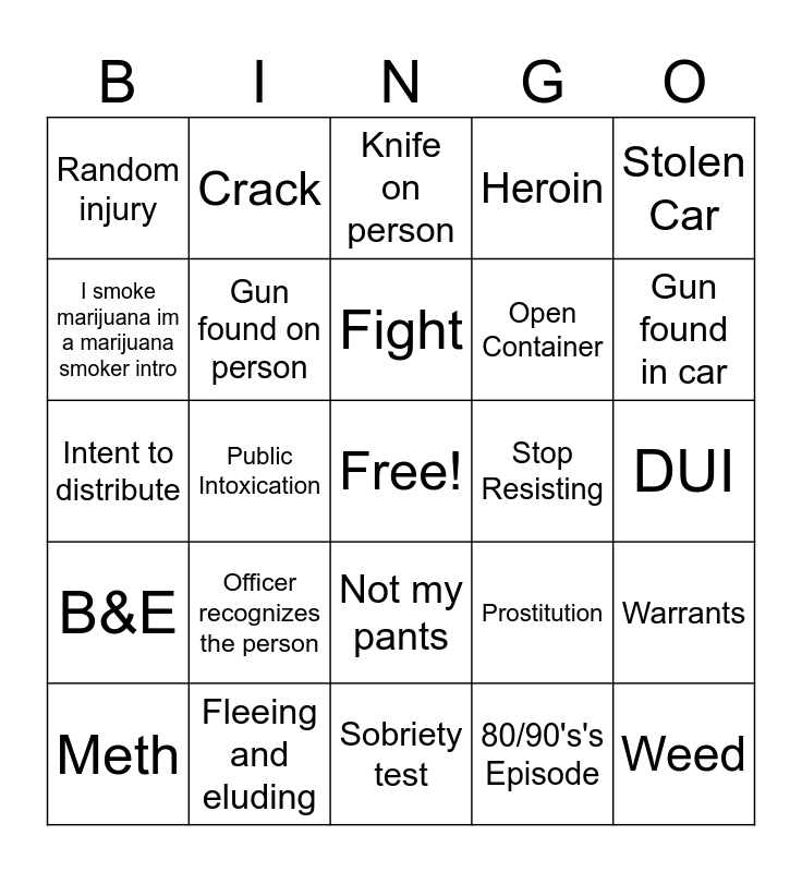 This bingo card has a free space and 24 words: Meth, Officer recognizes the person, Fight, 80/90's's Episode, Stolen Car, Random injury, Crack, Knife on person, Stop Resisting, DUI, Intent to distribute, Gun found on person, Prostitution, Warrants, I smoke marijuana im a marijuana smoker intro, Fleeing and eluding, Sobriety test, Heroin, Gun found in car, B&E, Public Intoxication, Not my pants, Open Container and Weed.