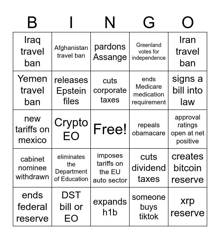 This bingo card has a free space and 25 words: eliminates the Department of Education, expands h1b, cuts corporate taxes, ends federal reserve, Iran travel ban, Iraq travel ban, Yemen travel ban, Afghanistan travel ban, repeals obamacare, imposes tariffs on the EU auto sector, ends Medicare medication requirement, new tariffs on mexico, cuts dividend taxes, creates bitcoin reserve, releases Epstein files, ends taxes on tips, approval ratings open at net positive, pardons Assange, signs a bill into law, Crypto EO, xrp reserve, DST bill or EO, cabinet nominee withdrawn, Greenland votes for independence and someone buys tiktok.