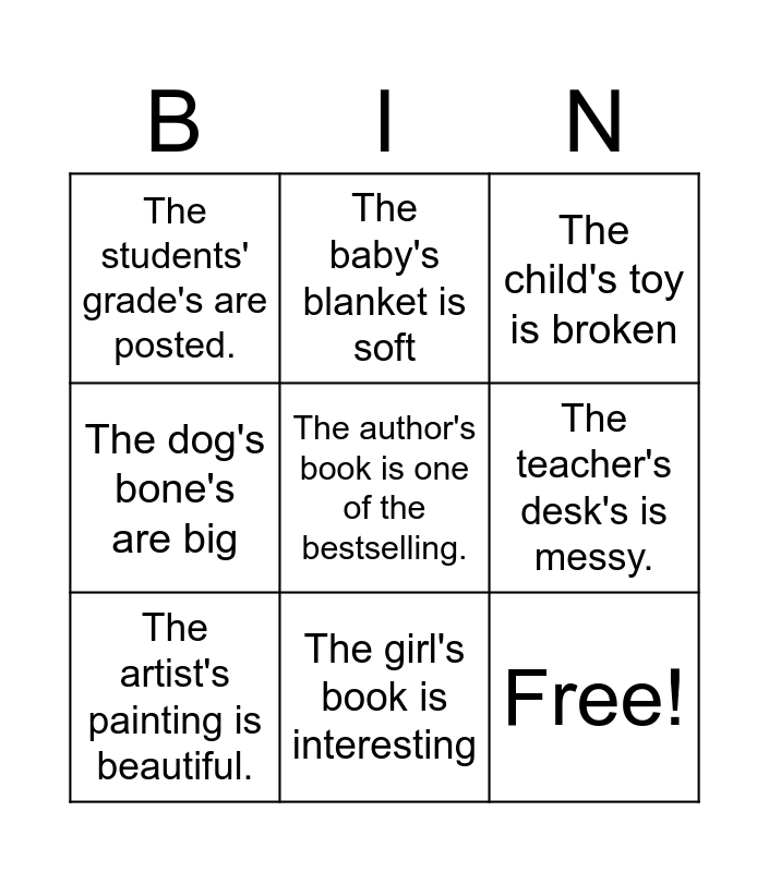 This bingo card has 16 words: The cat's toy is red., The mans car is very fast., The child's toy is broken, The students' grade's are posted., Free!, The baby's blanket is soft, The musician's guitar is one of kind., The woman's purse is expensive, The author's book is one of the bestselling., The teacher's desk's is messy., The teacher's desk's are messy., The dog's bone's are big, The boy's bike is fast., The girl's book is interesting, The artist's painting is beautiful. and The parent's car is new..