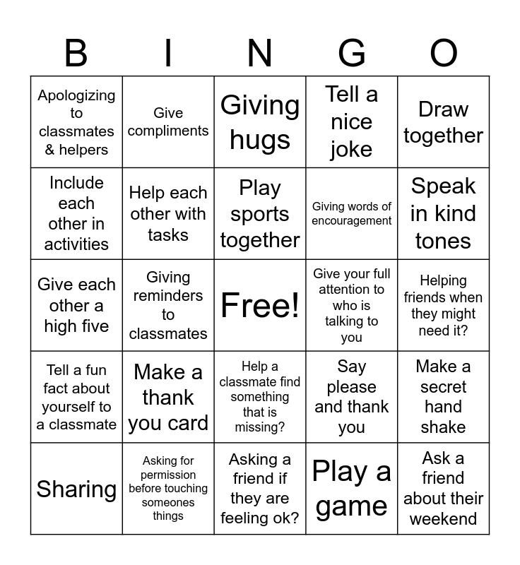 This bingo card has a free space and 24 words: Make a thank you card, Asking for permission before touching someones things, Play sports together, Sharing, Draw together, Apologizing to classmates & helpers, Include each other in activities, Give compliments, Give your full attention to who is talking to you, Help a classmate find something that is missing?, Giving words of encouragement, Give each other a high five, Say please and thank you, Make a secret hand shake, Help each other with tasks, Play a game, Helping friends when they might need it?, Giving hugs, Speak in kind tones, Giving reminders to classmates, Ask a friend about their weekend, Tell a fun fact about yourself to a classmate, Tell a nice joke and Asking a friend if they are feeling ok?.