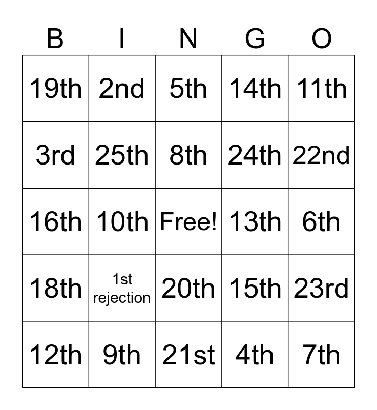 This bingo card has a free space and 24 words: 1st rejection, 9th, 8th, 12th, 11th, 19th, 3rd, 2nd, 13th, 20th, 24th, 16th, 15th, 23rd, 25th, 4th, 6th, 5th, 22nd, 10th, 7th, 18th, 14th and 21st.