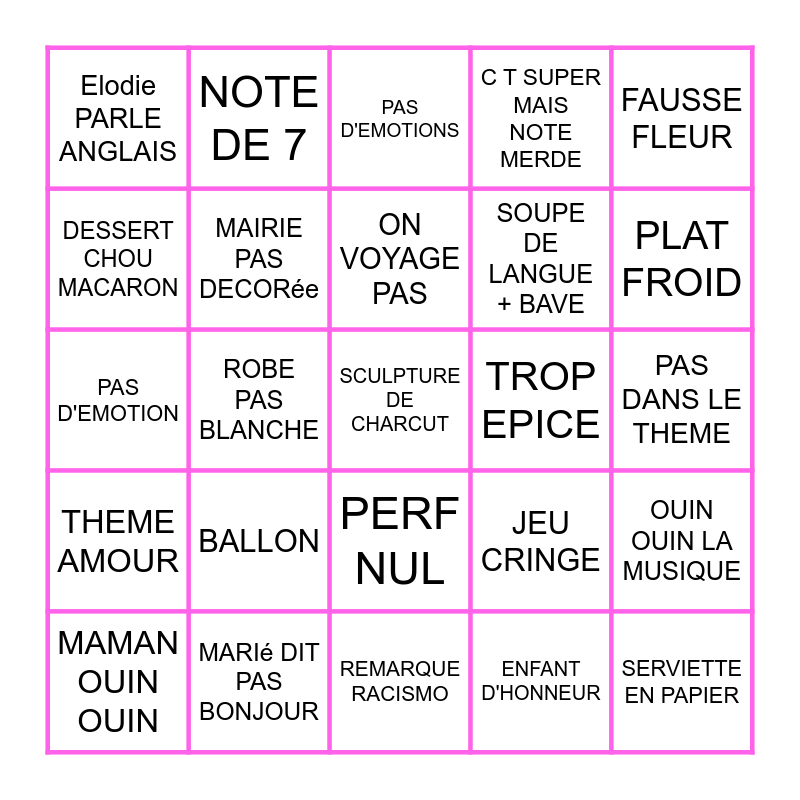 This bingo card has 25 words: BALLON, REMARQUE RACISMO, ON VOYAGE PAS, MAMAN OUIN OUIN, FAUSSE FLEUR, Elodie PARLE ANGLAIS, DESSERT CHOU MACARON, NOTE DE 7, TROP EPICE, PERF NUL, SOUPE DE LANGUE + BAVE, PAS D'EMOTION, JEU CRINGE, OUIN OUIN LA MUSIQUE, MAIRIE PAS DECORée, SERVIETTE EN PAPIER, PAS DANS LE THEME, PAS D'EMOTIONS, PLAT FROID, ROBE PAS BLANCHE, SCULPTURE DE CHARCUT, MARIé DIT PAS BONJOUR, THEME AMOUR, C T SUPER MAIS NOTE MERDE and ENFANT D'HONNEUR.