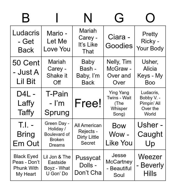 This bingo card has a free space and 52 words: Mariah Carey - We Belong Together, Weezer - Beverly Hills, The Killers - Mr. Brightside, Pussycat Dolls - Don’t Cha, Green Day - Holiday / Boulevard of Broken Dreams, 50 Cent - Disco Inferno, Mario - Let Me Love You, Missy Elliott - Lose Control, 50 Cent - Just A Lil Bit, 50 Cent - Candy Shop, Mariah Carey - Shake it Off, The Game - How We Do, Usher - Caught Up, Bow Wow - Like You, Lil Jon & The Eastside Boyz - Lovers & Friends, Snoop Dogg - Drop it Like it’s Hot, Baby Bash - Baby, I’m Back, Ying Yang Twins - Wait (The Whisper Song), Foo Fighters - Best of You, Pretty Ricky - Your Body, T-Pain - I’m Sprung, Jesse McCartney - Beautiful Soul, Ludacris - Get Back, Nelly, Tim McGraw - Over and Over, 50 Cent, Mobb Deep - Outta Control, Maroon 5 - Sunday Morning, Ying Yang Twins - Badd, Ashanti - Only U, Usher, Alicia Keys - My Boo, Pussycat Dolls - Stickwitu, Frankie J - More Than Words, Ciara - Goodies, Destiny’s Child - Lose My Breath, Ting Yang Twins, Pitbull - Shake, Black Eyed Peas - My Humps, Mariah Carey - It’s Like That, Lil Jon & The Eastside Boyz - What U Gon’ Do, Blake Shelton - Some Beach, Destiny’s Child - Soldier, Akon - Lonely, David Banner - Play, Ludacris, Bobby V. - Pimpin’ All Over the World, T.I. - Bring Em Out, Gorrillaz - Feel Good Inc., All American Rejects - Dirty Little Secret, Hinder - Lips of an Angel, Rihanna - Pon de Replay, D4L - Laffy Taffy, Kanye West - Gold Digger, Madonna - Hung Up, Black Eyed Peas - Don’t Phunk With My Heart and Brooke Valentine - Girlfight (Remix).