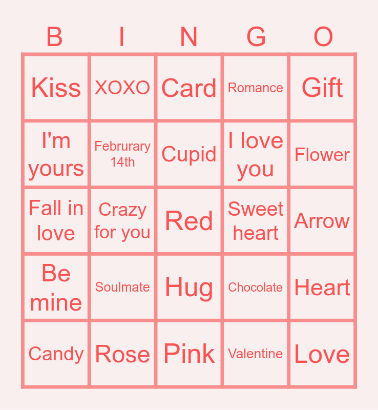 This bingo card has 25 words: Soulmate, Pink, Cupid, Candy, Gift, Kiss, I'm yours, XOXO, Sweet heart, Hug, I love you, Fall in love, Chocolate, Heart, Februrary 14th, Love, Arrow, Card, Flower, Crazy for you, Red, Rose, Be mine, Romance and Valentine.