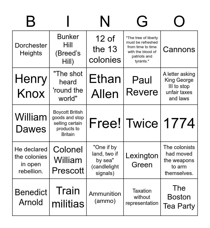 This bingo card has a free space and 25 words: Colonel William Prescott, Ammunition (ammo), Ethan Allen, Benedict Arnold, Cannons, Dorchester Heights, Henry Knox, Bunker Hill (Breed’s Hill), Twice, "One if by land, two if by sea" (candlelight signals), Paul Revere, William Dawes, Lexington Green, The colonists had moved the weapons to arm themselves., "The shot heard 'round the world", Boycott British goods and petition for rights, 1774, 12 of the 13 colonies, A letter asking King George III to stop unfair taxes and laws, Boycott British goods and stop selling certain products to Britain, The Boston Tea Party, Train militias, He declared the colonies in open rebellion., "The tree of liberty must be refreshed from time to time with the blood of patriots and tyrants." and Taxation without representation.
