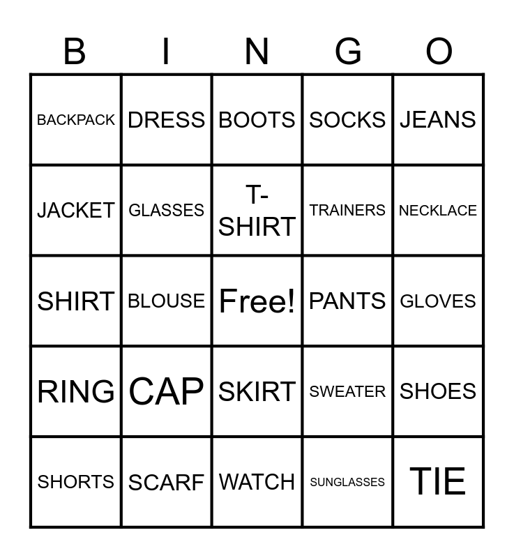 This bingo card has a free space and 25 words: CAP, WATCH, T-SHIRT, SHORTS, JEANS, BACKPACK, JACKET, DRESS, PANTS, SKIRT, TRAINERS, SHIRT, SWEATER, SHOES, GLASSES, COAT, GLOVES, BOOTS, NECKLACE, BLOUSE, TIE, SCARF, RING, SOCKS and SUNGLASSES.