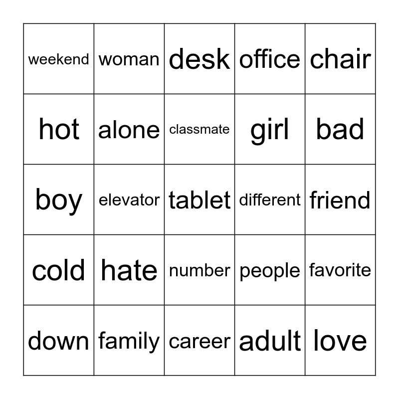 This bingo card has 32 words: adult, book, elevator, phone, cold, alone, chair, favorite, woman, love, classmate, desk, apartment, bye, different, lesson, down, boy, number, hate, people, library, friend, family, tablet, office, girl, hot, weekend, career, neighbor and bad.