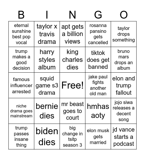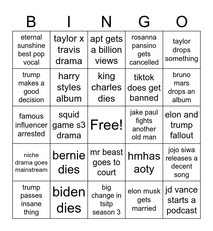 This bingo card has a free space and 24 words: bernie dies, biden dies, king charles dies, trump passes insane thing, taylor drops something, eternal sunshine best pop vocal, trump makes a good decision, taylor x travis drama, jake paul fights another old man, mr beast goes to court, tiktok does get banned, famous influencer arrested, hmhas aoty, jojo siwa releases a decent song, harry styles album, elon musk gets married, elon and trump fallout, apt gets a billion views, bruno mars drops an album, squid game s3 drama, jd vance starts a podcast, niche drama goes mainstream, rosanna pansino gets cancelled and big change in tsitp season 3.