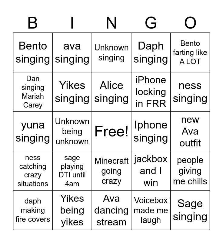 This bingo card has a free space and 24 words: sage playing DTI until 4am, Yikes being yikes, Alice singing, daph making fire covers, Bento farting like A LOT, Bento singing, Dan singing Mariah Carey, ava singing, Iphone singing, Minecraft going crazy, iPhone locking in FRR, yuna singing, jackbox and I win, people giving me chills, Yikes singing, Voicebox made me laugh, new Ava outfit, Unknown singing, ness singing, Unknown being unknown, Sage singing, ness catching crazy situations, Daph singing and Ava dancing stream.