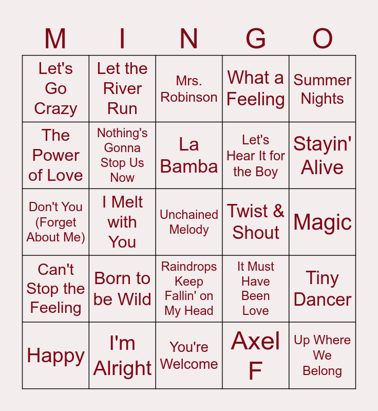 This bingo card has 35 words: You've Lost That Lovin' Feeling, Call Me, In Your Eyes, Nothing's Gonna Stop Us Now, Raindrops Keep Fallin' on My Head, What a Feeling, The Power of Love, Ghostbusters, La Bamba, 9 to 5, Don't You (Forget About Me), Summer Nights, I Say a Little Prayer for You, Old Time Rock N Roll, Let's Go Crazy, Twist & Shout, Axel F, I Melt with You, Can't Stop the Feeling, Unchained Melody, It Must Have Been Love, Happy, Tiny Dancer, I'm Alright, Mrs. Robinson, Stayin' Alive, Up Where We Belong, Don't Worry Be Happy, Let's Hear It for the Boy, Magic, Eye of the Tiger, You're Welcome, Born to be Wild, Let the River Run and I've Had the Time of My Life.