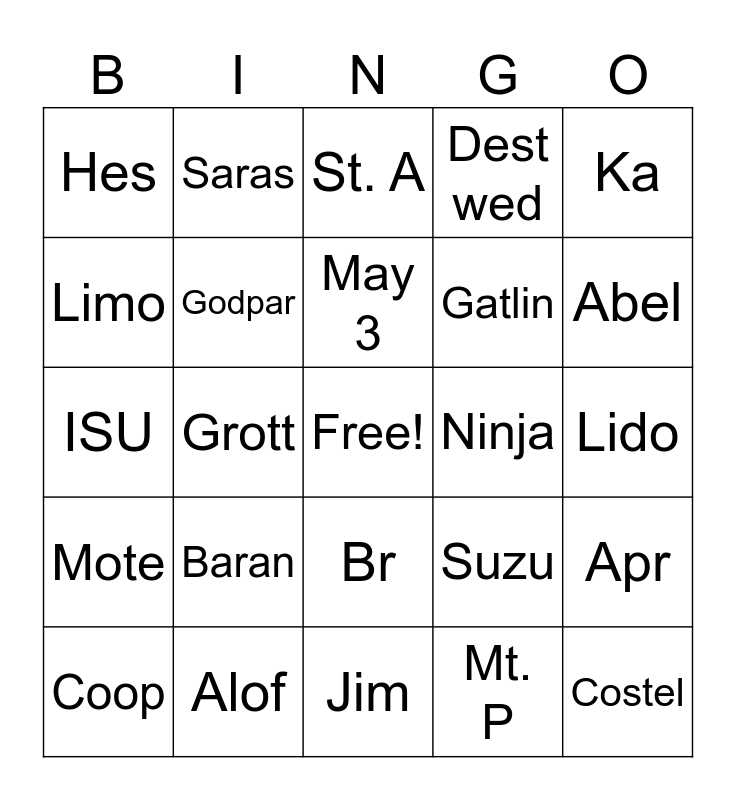 This bingo card has a free space and 24 words: Baran, Alof, May 3, Coop, Ka, Hes, Limo, Saras, Ninja, Br, Gatlin, ISU, Suzu, Apr, Godpar, Mt. P, Lido, St. A, Abel, Grott, Costel, Mote, Dest wed and Jim.