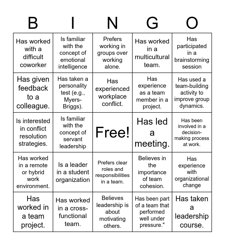 This bingo card has a free space and 24 words: Has worked in a team project., Is a leader in a student organization, Has experienced workplace conflict., Has been part of a team that performed well under pressure.", Has participated in a brainstorming session, Has worked with a difficult coworker, Is familiar with the concept of emotional intelligence, Prefers working in groups over working alone., Has led a meeting., Has been involved in a decision-making process at work., Is interested in conflict resolution strategies., Has taken a personality test (e.g., Myers-Briggs)., Believes in the importance of team cohesion., Has experience with organizational change, Has given feedback to a colleague., Has worked in a cross-functional team., Believes leadership is about motivating others., Has worked in a multicultural team., Has used a team-building activity to improve group dynamics., Has worked in a remote or hybrid work environment., Is familiar with the concept of servant leadership, Prefers clear roles and responsibilities in a team., Has experience as a team member in a project. and Has taken a leadership course..