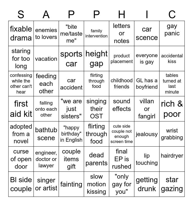 This bingo card has 49 words: lip touching, everyone is gay, "only gay for you", falling onto each other, car accident, rich & poor, enemies to lovers, fainting, car scence, flirting through food, gay panic, family intervention, GL has a boyfriend, childhood friends, engineer, doctor or lawyer, villan or fangirl, staring for too long, accidental kiss, hairdryer, letters or notes, product placement, "we are just sisters", fixable drama, vacation, Bl side couple, sports car, tables turned at last minute, singer or artist, flirting through food, feeding each other, star gazing, sound effects, curse of open door, couple items gift, first aid kit, cute side couple not enough screen time, jealousy, wrist grabbing, confessing while the other can't hear, "happy birthday" in English, dead parents, adopted from a novel, singing their OST, slow motion kissing, height gap, "bite me/taste me", final EP is rushed, bathtub scene and getting drunk.