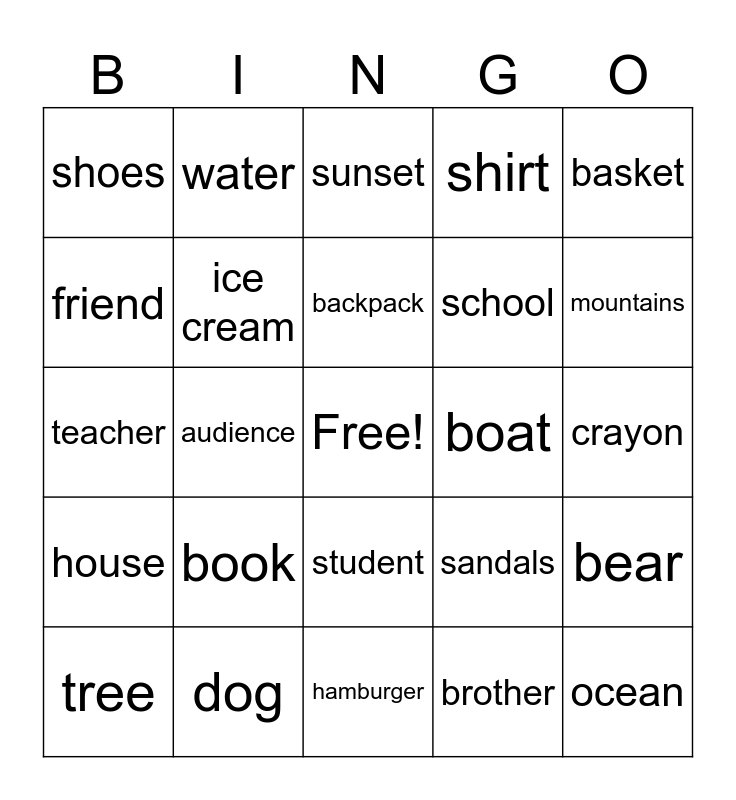 This bingo card has a free space and 24 words: book, dog, backpack, tree, basket, shoes, friend, water, boat, student, school, teacher, sandals, bear, ice cream, brother, crayon, sunset, mountains, audience, ocean, house, shirt and hamburger.