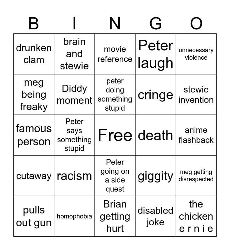 This bingo card has a free space and 24 words: racism, homophobia, peter doing something stupid, pulls out gun, unnecessary violence, drunken clam, meg being freaky, brain and stewie, death, Peter going on a side quest, cringe, famous person, giggity, meg getting disrespected, Diddy moment, disabled joke, anime flashback, movie reference, stewie invention, Peter says something stupid, the chicken e r n i e, cutaway, Peter laugh and Brian getting hurt.