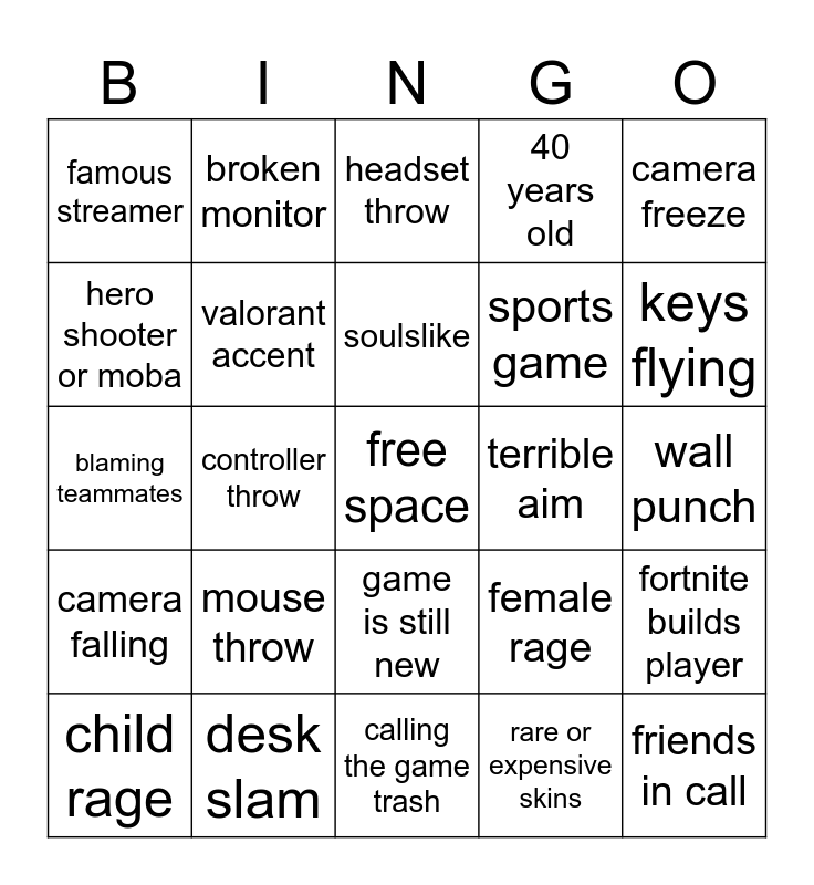 This bingo card has a free space and 24 words: mouse throw, desk slam, soulslike, child rage, camera freeze, famous streamer, hero shooter or moba, broken monitor, terrible aim, game is still new, sports game, blaming teammates, female rage, fortnite builds player, valorant accent, rare or expensive skins, wall punch, headset throw, keys flying, controller throw, friends in call, camera falling, 40 years old and calling the game trash.