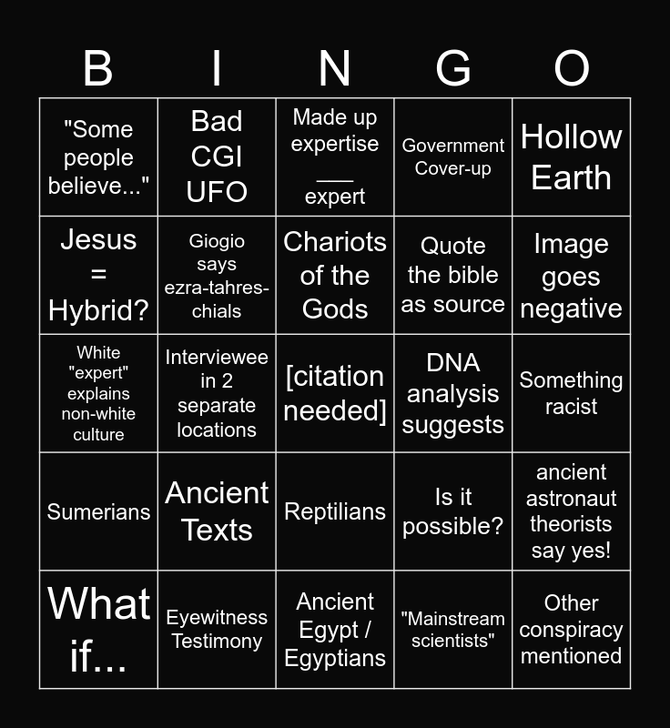 This bingo card has a free space and 27 words: Is it possible?, "some ancient astronaut theorists suggest", Quote the bible as source, Ancient Egypt / Egyptians, Jesus = Hybrid?, Made up expertise ___ expert, Bad CGI UFO, Sumerians, DNA analysis suggests, ancient astronaut theorists say yes!, White "expert" explains non-white culture, Government Cover-up, What if..., Eyewitness Testimony, Image goes negative, Reenactment, Giogio says ezra-tahres-chials, Chariots of the Gods, Ancient Texts, "Some people believe...", Something racist, "Mainstream scientists", Interviewee in 2 separate locations, Other conspiracy mentioned, Reptilians, Hollow Earth and Reference Classical Painting.