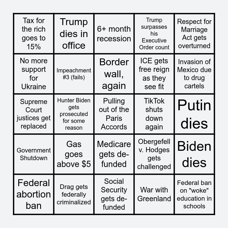 This bingo card has a free space and 24 words: Gas goes above $5, Drag gets federally criminalized, Border wall, again, Federal abortion ban, Respect for Marriage Act gets overturned, Tax for the rich goes to 15%, No more support for Ukraine, Trump dies in office, TikTok shuts down again, Medicare gets de-funded, ICE gets free reign as they see fit, Supreme Court justices get replaced, Obergefell v. Hodges gets challenged, Biden dies, Impeachment #3 (fails), War with Greenland, Putin dies, 6+ month recession, Invasion of Mexico due to drug cartels, Hunter Biden gets prosecuted for some reason, Federal ban on "woke" education in schools, Government Shutdown, Trump surpasses his Executive Order count and Social Security gets de-funded.