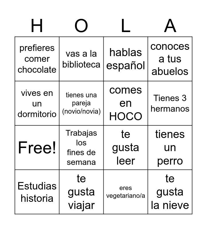 This bingo card has 20 words: Estudias historia, vas al gimnasio, hablas español, tienes un perro, eres alérgico/a, Trabajas los fines de semana, eres vegetariano/a, conoces a tus abuelos, Free!, vas a la biblioteca, te gusta leer, Tienes 3 hermanos, prefieres comer chocolate, te gusta viajar, comes en HOCO, tienes clase de matematicas este semestre, vives en un dormitorio, tienes una pareja (novio/novia), prefieres el verano and te gusta la nieve.