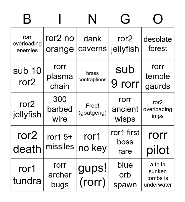 This bingo card has a free space and 34 words: ror2 no glass, blue orb spawn, ror1 stage 1 amethyst, sub 35m, ror2 death, rorr plasma chain, desolate forest, ror1 tundra, ror2 no orange, ror2 rare, brass contraptions, dank caverns, rorr 20+ mitosis, no sand shrine in bazaar, rorr ancient wisps, rorr temple gaurds, rorr archer bugs, ror2 jellyfish, ror1 5+ missiles, ror1 first boss rare, ror1 no key, ror1 bad temple for boxwarp, rorr overloading enemies, ror2 overloading imps, gups! (rorr), a tp in sunken tombs is underwater, ror2 jellyfish, at least 1 reset, sub 9 rorr, sub 10 ror2, ror1 3+ rares, 300 barbed wire, rorr pilot and rorr miner.