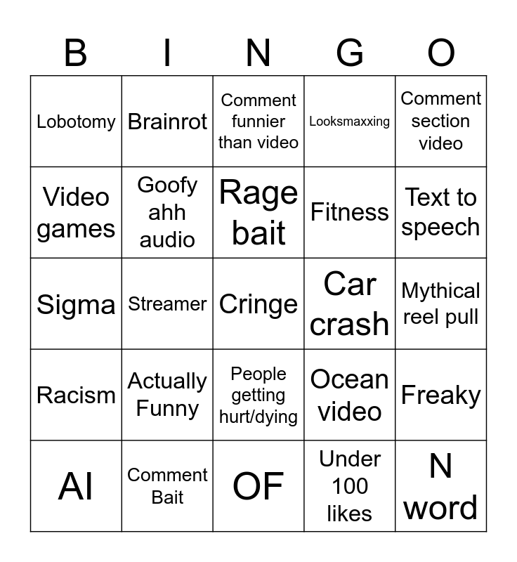 This bingo card has a free space and 24 words: Actually Funny, Comment Bait, Rage bait, AI, Comment section video, Lobotomy, Video games, Brainrot, Car crash, People getting hurt/dying, Fitness, Sigma, Ocean video, Freaky, Goofy ahh audio, Under 100 likes, Mythical reel pull, Comment funnier than video, Text to speech, Streamer, N word, Racism, Looksmaxxing and OF.