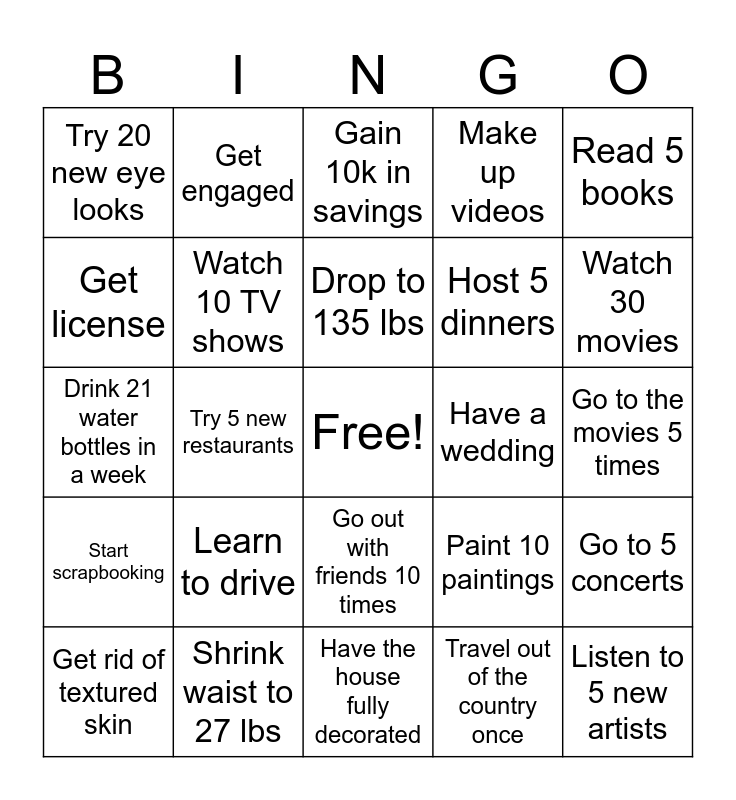 This bingo card has a free space and 24 words: Learn to drive, Shrink waist to 27 lbs, Drop to 135 lbs, Get rid of textured skin, Read 5 books, Try 20 new eye looks, Get license, Get engaged, Have a wedding, Go out with friends 10 times, Host 5 dinners, Drink 21 water bottles in a week, Paint 10 paintings, Go to 5 concerts, Watch 10 TV shows, Travel out of the country once, Go to the movies 5 times, Gain 10k in savings, Watch 30 movies, Try 5 new restaurants, Listen to 5 new artists, Start scrapbooking, Make up videos and Have the house fully decorated.