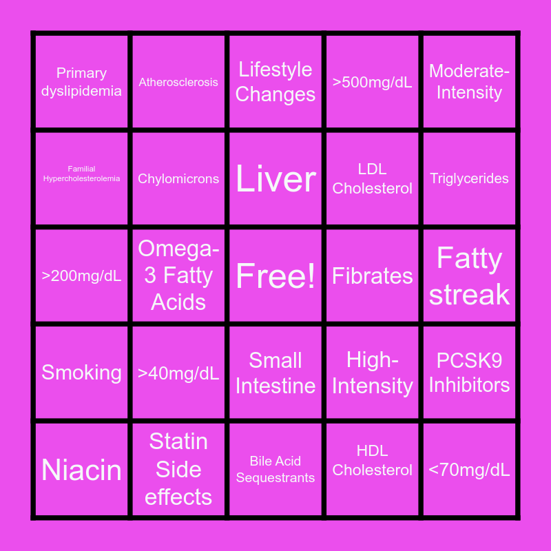 This bingo card has a free space and 28 words: PCSK9 Inhibitors, HMG-CoA Reductase Inhibitors, LDL Cholesterol, HDL Cholesterol, Familial Hypercholesterolemia, Lifestyle Changes, Atherosclerosis, Smoking, Fibrates, Niacin, >200mg/dL, >500mg/dL, Statin Side effects, Bile Acid Sequestrants, Triglycerides, <150mg/dL, >40mg/dL, Chylomicrons, Liver, Small Intestine, Primary dyslipidemia, Xanthomas, <70mg/dL, Omega-3 Fatty Acids, Fatty streak, High-Intensity, Moderate-Intensity and Secondary dyslipidemia.