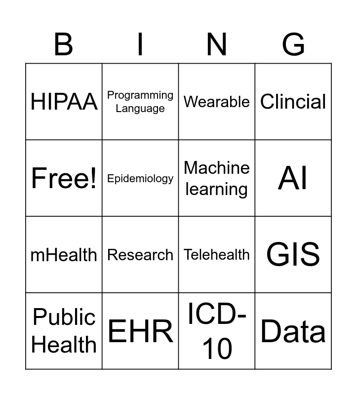 This bingo card has 16 words: EHR, GIS, Wearable, HIPAA, mHealth, Programming Language, Telehealth, ICD-10, Free!, Epidemiology, Public Health, Clincial, Research, AI, Machine learning and Data.
