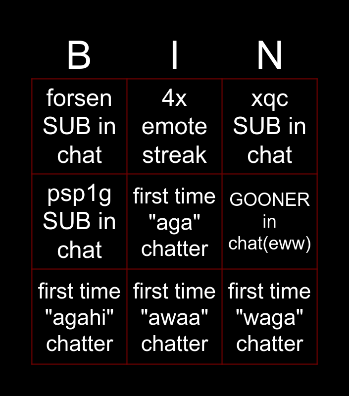 This bingo card has a free space and 8 words: GOONER in chat(eww), xqc SUB in chat, 4x emote streak, first time "agahi" chatter, forsen SUB in chat, first time "waga" chatter, psp1g SUB in chat and first time "awaa" chatter.
