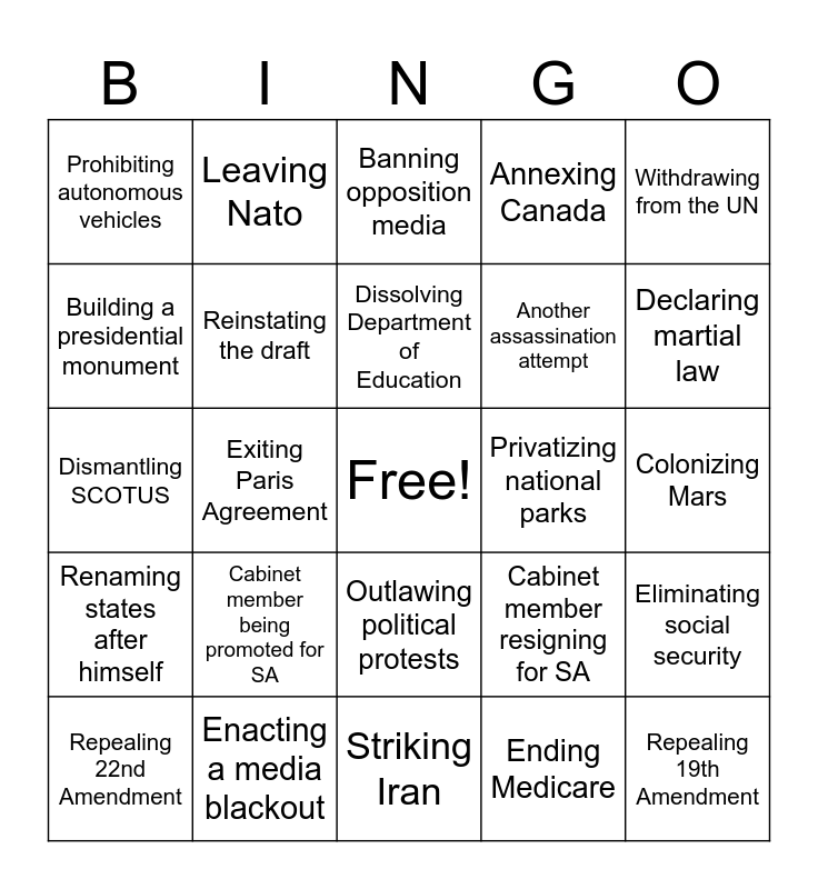 This bingo card has a free space and 24 words: Cabinet member being promoted for SA, Enacting a media blackout, Dissolving Department of Education, Repealing 22nd Amendment, Withdrawing from the UN, Prohibiting autonomous vehicles, Building a presidential monument, Leaving Nato, Privatizing national parks, Outlawing political protests, Another assassination attempt, Dismantling SCOTUS, Cabinet member resigning for SA, Eliminating social security, Reinstating the draft, Ending Medicare, Colonizing Mars, Banning opposition media, Declaring martial law, Exiting Paris Agreement, Repealing 19th Amendment, Renaming states after himself, Annexing Canada and Striking Iran.