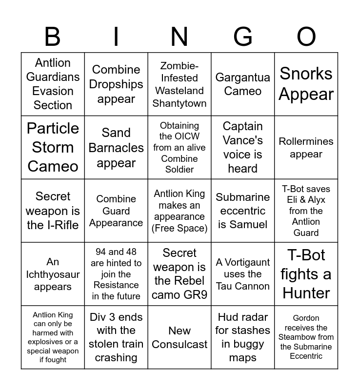This bingo card has a free space and 24 words: 94 and 48 are hinted to join the Resistance in the future, Div 3 ends with the stolen train crashing, Obtaining the OICW from an alive Combine Soldier, Antlion King can only be harmed with explosives or a special weapon if fought, Snorks Appear, Antlion Guardians Evasion Section, Particle Storm Cameo, Combine Dropships appear, Submarine eccentric is Samuel, Secret weapon is the Rebel camo GR9, Captain Vance's voice is heard, Secret weapon is the I-Rifle, A Vortigaunt uses the Tau Cannon, T-Bot fights a Hunter, Sand Barnacles appear, Hud radar for stashes in buggy maps, T-Bot saves Eli & Alyx from the Antlion Guard, Zombie-Infested Wasteland Shantytown, Rollermines appear, Combine Guard Appearance, Gordon receives the Steambow from the Submarine Eccentric, An Ichthyosaur appears, Gargantua Cameo and New Consulcast.