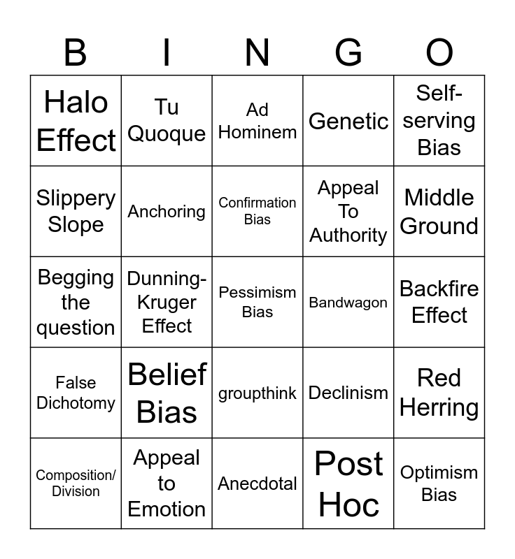 This bingo card has 28 words: Red Herring, Straw Man, Appeal To Authority, Post Hoc, Slippery Slope, Ad Hominem, Tu Quoque, False Dichotomy, Bandwagon, Composition/ Division, Begging the question, Genetic, Appeal to Emotion, Anecdotal, Middle Ground, Sunk Cost, Belief Bias, Anchoring, Confirmation Bias, groupthink, Halo Effect, Optimism Bias, Pessimism Bias, Dunning-Kruger Effect, Backfire Effect, Declinism, Self-serving Bias and Curse of Knowledge.