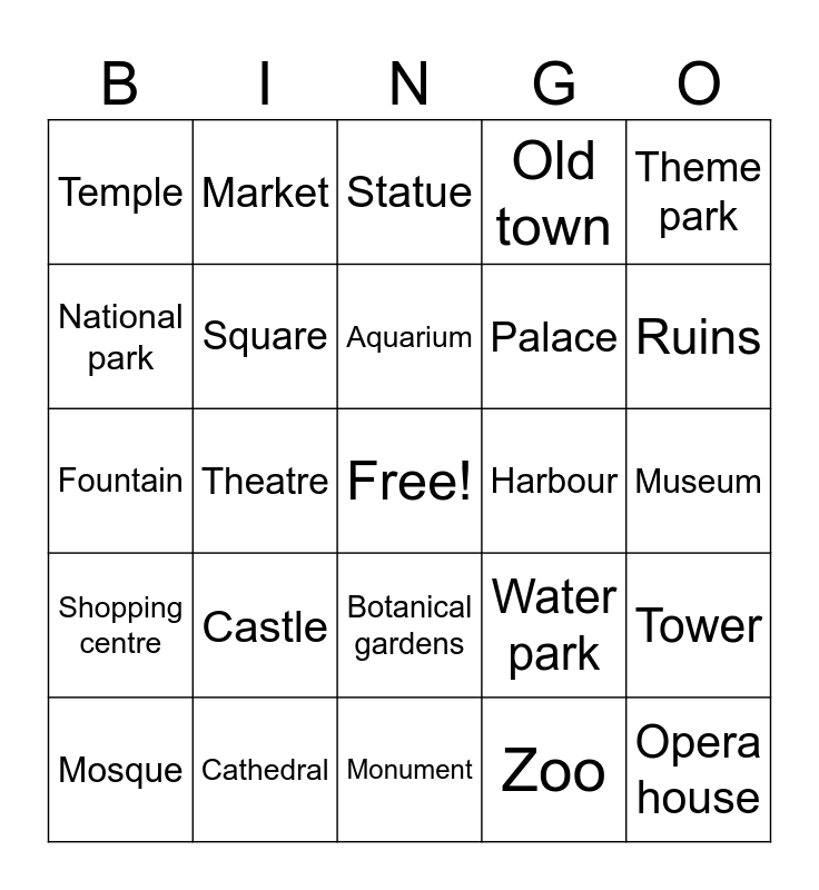 This bingo card has a free space and 24 words: Castle, Cathedral, Aquarium, Mosque, Theme park, Temple, National park, Market, Harbour, Botanical gardens, Palace, Fountain, Water park, Tower, Square, Zoo, Museum, Statue, Ruins, Theatre, Opera house, Shopping centre, Old town and Monument.