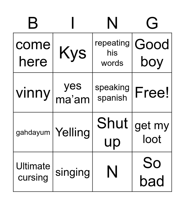 This bingo card has 17 words: N, Ultimate cursing, repeating his words, come here, Yelling, Good boy, get my loot, speaking spanish, Free!, yes ma’am, singing, Shut up, vinny, Kys, gahdayum, Racist and So bad.