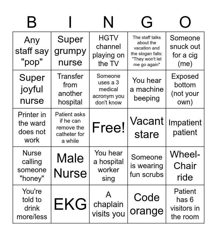 This bingo card has a free space and 24 words: Male Nurse, EKG, Someone uses a 3 medical acronym you don't know, You're told to drink more/less, Someone snuck out for a cig (me), Any staff say "pop", Super joyful nurse, Super grumpy nurse, Vacant stare, You hear a hospital worker sing, You hear a machine beeping, Printer in the ward does not work, Someone is wearing fun scrubs, Wheel-Chair ride, Transfer from another hospital, Code orange, Impatient patient, HGTV channel playing on the TV, Exposed bottom (not your own), Patient asks if he can remove the catheter for a while, Patient has 6 visitors in the room, Nurse calling someone "honey", The staff talks about the vacation and the slogan falls: "They won't let me go again" and A chaplain visits you.