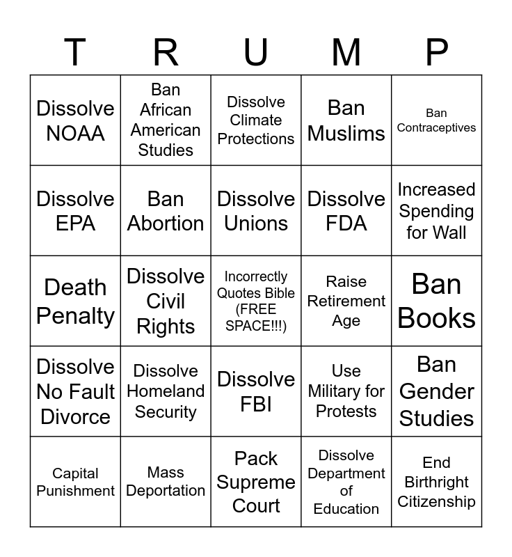 This bingo card has a free space and 32 words: Dissolve Department of Education, Mandatory Christian Curriculum, Dissolve Civil Rights, Dissolve DEI Protections, Dissolve No Fault Divorce, Ban Abortion, Ban Contraceptives, Ban Gender Studies, Ban African American Studies, Tax Cuts For Corporations, Dissolve Unions, Dissolve Climate Protections, Increase in Oil Drilling, Dissolve Business Regulations, Raise Retirement Age, Dissolve Social Security, Capital Punishment, Death Penalty, Dissolve FBI, Dissolve Homeland Security, Use Military for Protests, Ban Free School Meals, Ban Books, Mass Deportation, End Birthright Citizenship, Ban Muslims, Dissolve FDA, Dissolve EPA, Dissolve NOAA, Pack Supreme Court, 4 School Shootings in 1st Year and Increased Spending for Wall.
