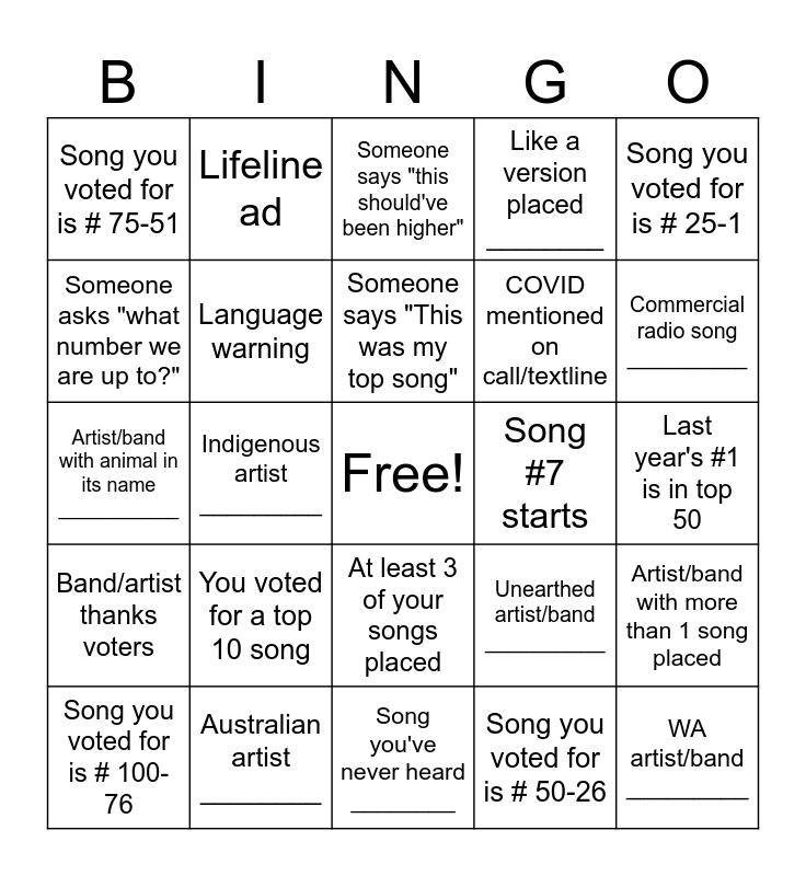 This bingo card has a free space and 24 words: Song you voted for is # 100-76, You voted for a top 10 song, Someone says "This was my top song", Song you voted for is # 50-26, Song you voted for is # 25-1, Song you voted for is # 75-51, Lifeline ad, Someone says "this should've been higher", Song #7 starts, Last year's #1 is in top 50, Artist/band with animal in its name ___________, Language warning, Unearthed artist/band __________, Artist/band with more than 1 song placed, Someone asks "what number we are up to?", Australian artist ________, Song you've never heard ________, Like a version placed ________, Commercial radio song __________, Band/artist thanks voters, Indigenous artist _________, At least 3 of your songs placed, COVID mentioned on call/textline and WA artist/band _________.
