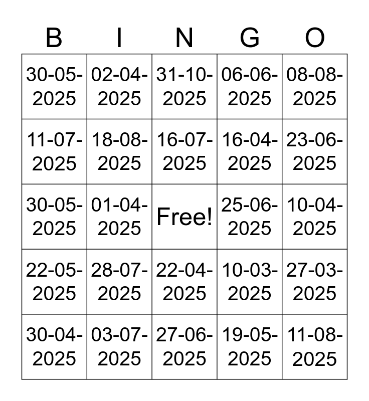 This bingo card has a free space and 141 words: 03-03-2025, 04-03-2025, 05-03-2025, 06-03-2025, 07-03-2025, 10-03-2025, 10-03-2025, 11-03-2025, 12-03-2025, 13-03-2025, 14-03-2025, 17-03-2025, 17-03-2025, 18-03-2025, 19-03-2025, 20-03-2025, 21-03-2025, 24-03-2025, 24-03-2025, 25-03-2025, 26-03-2025, 27-03-2025, 28-03-2025, 31-03-2025, 31-03-2025, 01-04-2025, 02-04-2025, 03-04-2025, 04-04-2025, 07-04-2025, 07-04-2025, 08-04-2025, 09-04-2025, 10-04-2025, 11-04-2025, 14-04-2025, 14-04-2025, 15-04-2025, 16-04-2025, 17-04-2025, 18-04-2025, 22-04-2025, 22-04-2025, 23-04-2025, 23-04-2025, 24-04-2025, 24-04-2025, 25-04-2025, 25-04-2025, 28-04-2025, 28-04-2025, 29-04-2025, 30-04-2025, 01-05-2025, 02-05-2025, 05-05-2025, 08-05-2025, 09-05-2025, 12-05-2025, 15-05-2025, 16-05-2025, 19-05-2025, 20-05-2025, 21-05-2025, 22-05-2025, 22-05-2025, 23-05-2025, 23-05-2025, 26-05-2025, 27-05-2025, 28-05-2025, 30-05-2025, 30-05-2025, 02-06-2025, 03-06-2025, 04-06-2025, 05-06-2025, 06-06-2025, 06-06-2025, 09-06-2025, 13-06-2025, 16-06-2025, 20-06-2025, 23-06-2025, 23-06-2025, 24-06-2025, 25-06-2025, 26-06-2025, 27-06-2025, 30-06-2025, 30-06-2025, 01-07-2025, 02-07-2025, 03-07-2025, 04-07-2025, 07-07-2025, 07-07-2025, 08-07-2025, 09-07-2025, 10-07-2025, 11-07-2025, 14-07-2025, 14-07-2025, 15-07-2025, 16-07-2025, 17-07-2025, 18-07-2025, 21-07-2025, 25-07-2025, 28-07-2025, 01-08-2025, 04-08-2025, 08-08-2025, 11-08-2025, 15-08-2025, 18-08-2025, 22-08-2025, 25-08-2025, 29-08-2025, 01-09-2025, 05-09-2025, 08-09-2025, 12-09-2025, 15-09-2025, 19-09-2025, 22-09-2025, 26-09-2025, 29-09-2025, 03-10-2025, 06-10-2025, 10-10-2025, 13-10-2025, 17-10-2025, 20-10-2025, 24-10-2025, 27-10-2025, 31-10-2025, 03-11-2025, 07-11-2025, 10-11-2025 and 14-11-2025.