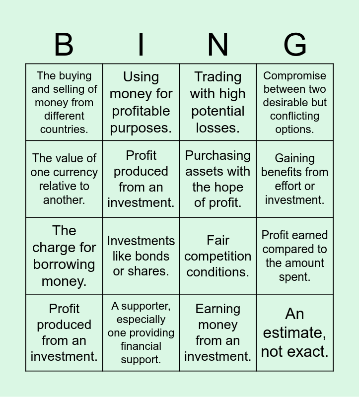 This bingo card has 16 words: A supporter, especially one providing financial support., Profit earned compared to the amount spent., Trading with high potential losses., The buying and selling of money from different countries., The charge for borrowing money., Using money for profitable purposes., Fair competition conditions., Earning money from an investment., The value of one currency relative to another., Profit produced from an investment., Profit produced from an investment., Compromise between two desirable but conflicting options., Investments like bonds or shares., Gaining benefits from effort or investment., Purchasing assets with the hope of profit. and An estimate, not exact..